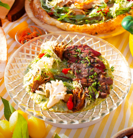- 채끝등심부빔밥 (19,500원) - 그릴에 구운 채끝 스테이크에 특제 고추 지미추리 소스와 버섯볶음장아찌를 버무린 한식과 양식의 퓨전 요리입니다.
