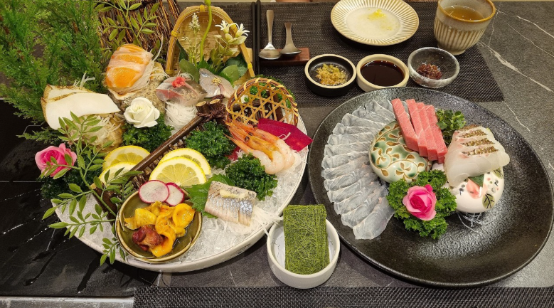 디너 C코스는 정통 일식의 매력을 느낄 수 있는 신선한 사시미와 7종의 해물모리, 구이 3종, 꼬막비빔밥 등이 포함된 풀코스예요.