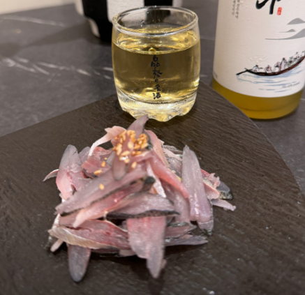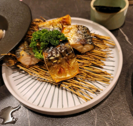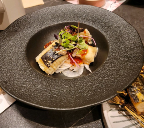 다음으로는 튀김(새우, 고구마, 깻잎)과 생선구이가 나왔어요. 새우 튀김은 비린맛 없이 바삭하게 튀겨져 나왔고, 생선구이는 매운 마요네즈 소스와 함께 먹으니 단백한 맛과 잘 어울렸어요.