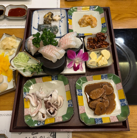 코스요리는 정말 알찬 구성으로 이루어져 있어요. 전복죽으로 시작해 신선한 샐러드, 멍게와 전복회, 두툼한 생선회, 랍스터회, 삼치회, 조개탕, 장어구이, 샤브샤브 등 다양한 요리들이 차례로 나와요.
