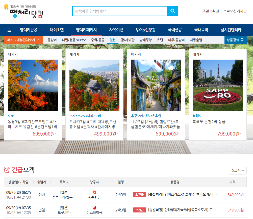 다양한 여행사의 땡처리 일본여행 패키지 상품을 한 번에 비교하고 싶다면, 국내 최대 땡처리 전문 사이트를 활용하는 것이 가장 효율적입니다.