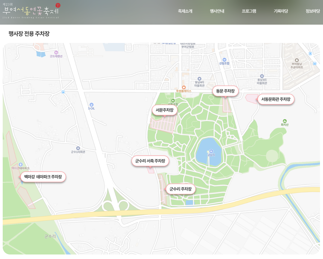 축제장과 다소 거리가 있는 부여대교 둔치, 부여군청, 백제중학교, 부여정보고등학교 등에 대규모 임시주차장이 마련됩니다.