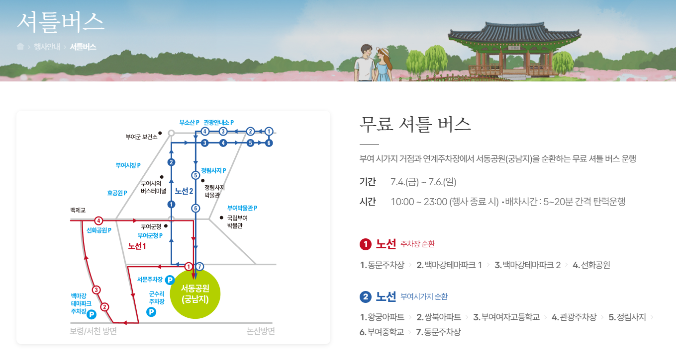 - 부여터미널에서 궁남지까지는? 👉 고민 없이 축제 기간 운행하는 '무료 셔틀버스'를 이용하세요.