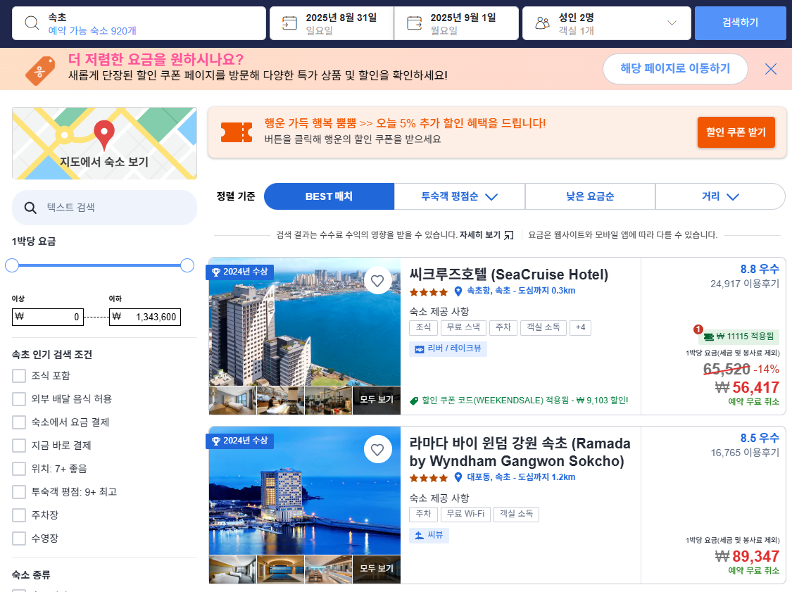 합리적인 가격에 멋진 오션뷰와 편리한 위치를 모두 잡고 싶다면 '씨크루즈 호텔'을 주목해 보세요. 속초 고속버스터미널 바로 앞에 위치해 뚜벅이 여행자에게 특히 인기가 많습니다.