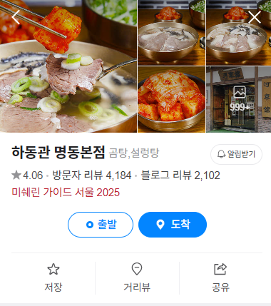 | 하동관 명동본점 | 곰탕, 수육 | 18,000~30,000원 | 80년 전통, 미슐랭, 한우, 토렴 | ★★★★★ |